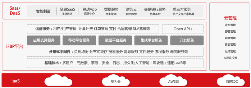 iFBP平台底层适配不同的IaaS,在PaaS层提供了企业级基础技术和互联网分布式中间件,以及开发、应用、移动、数据、集成、运营、运维等服务,满足互联网应用高并发、高性能、高可用的需求以及企业应用快速开发、灵活定制的需求,覆盖了从开发测试到运维运营各阶段所需要的技术能力,有效的支撑了上层的金融SaaS/DaaS服务和第三方服务,使得金融业务可以借助互联网得到快速发展。
