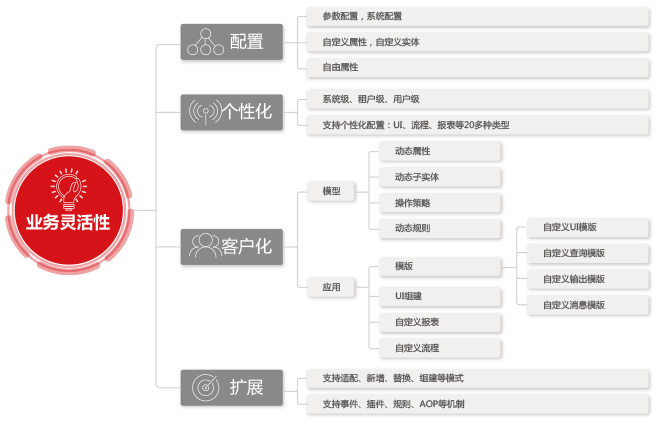 iFBP平台提供了基于元数据的动态建模体系,可灵活调整业务应用,可以自定义UI模板、查询模板、打印模板、消息模板等,同时提供了系统级、租户级、用户级等不同级别的个性化设计能力,可以满足客户的个性化需求。平台还提供了事件、插件、规则等适配和扩展能力,支持业务的灵活开发。