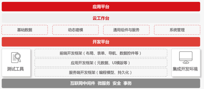 iFBP应用开发平台包括应用平台和开发平台两部分,应用平台提供了工作台和一系列基础数据以及适配金融行业的通用组件与服务,包括组织、权限、流程、打印、报表、预警、消息、账户管理、支付服务、风险控制、企业征信等。开发平台提供了基于元数据和UI模板的应用开发框架,可以实现业务的快速建模开发,同时具备业务的运行时动态调整能力。企业可基于应用开发平台快速构建开发自己的前中后台应用。