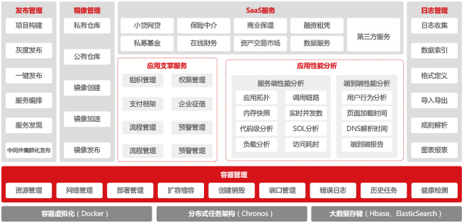 iFBP为平台上运行的金融应用和第三方服务提供统一的运行时云管理,帮助企业解决互联网高并发高可用的难题。平台基于容器技术实现了不同IaaS适配以及资源虚拟化,通过镜像和配置管理实现了在面对流量变化时的业务弹性伸缩,通过服务构建编排和灰度引流实现了业务快速迭代和不断试错,加快响应速度,同时云管理平台还为应用提供端到端的性能分析、统一日志检索及图表展现,支撑企业应用持续优化。