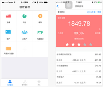 移动绩效实现了机构人员的业绩查询、考核结果查询、大客户查询、营销报备等功能,帮助客户经理实时掌握客户动态,查询个人绩效,同时帮助管理者实时查看绩效完成情况。