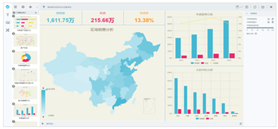 自助分析帮助客户快速搭建模型分析数据,通过多种可视化的方式直观的呈现数据中的规律与联系,并且支持多端运行。