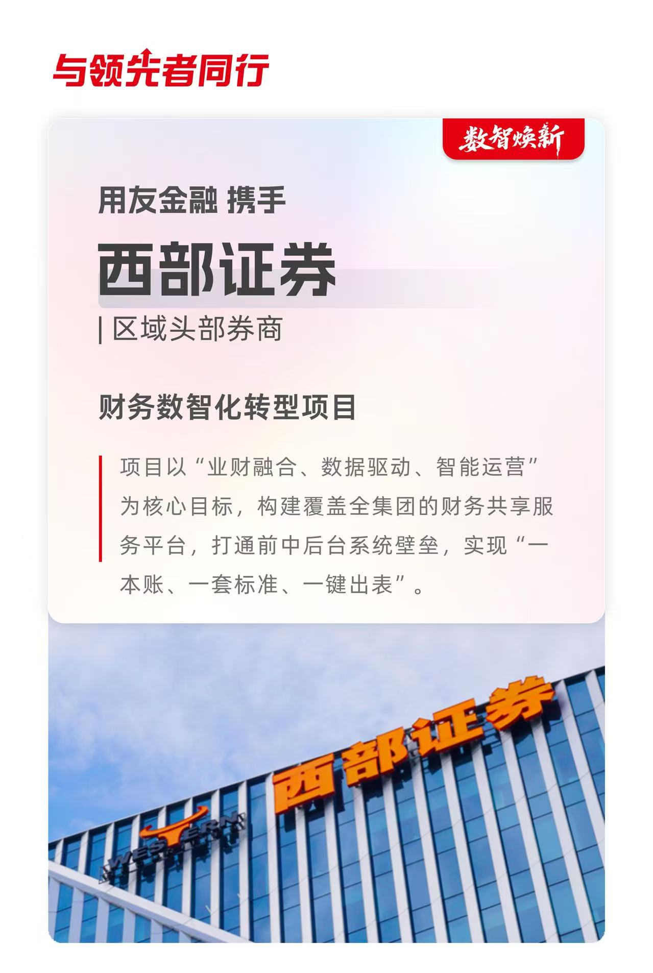 作为西部证券的长期合作伙伴,用友金融将继续深耕金融科技领域,持续升级财务数字化解决方案,携手西部证券在新一轮科技革命和产业变革中,为行业客户和终端用户创造更多价值,为数字经济的蓬勃发展与数字中国建设贡献源源不断的数字力量。