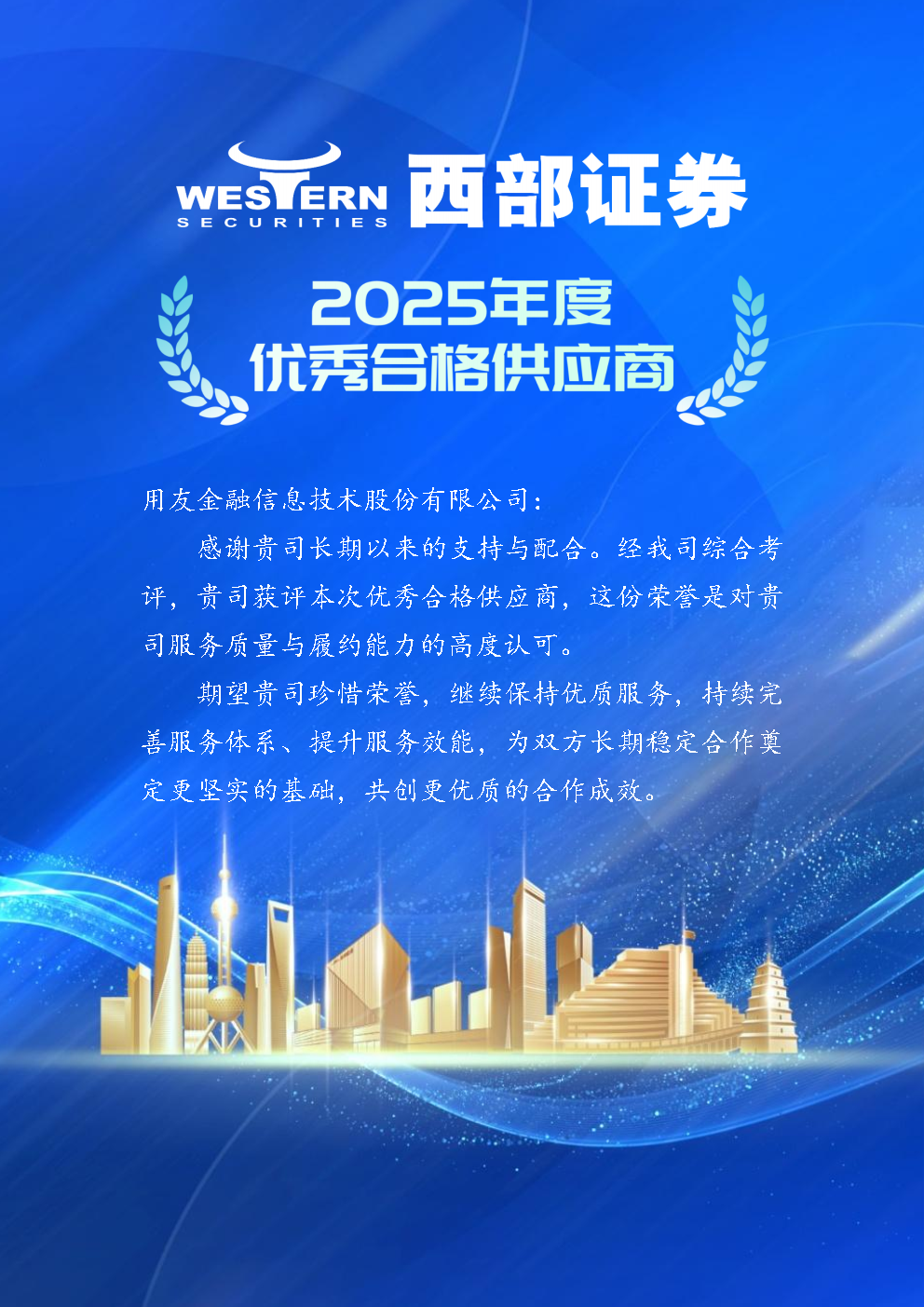 近日,用友金融凭借其在数智化领域的技术实力、创新表现以及与西部证券的长期深厚合作,被授予“2025年度优秀合格供应商”称号。该奖项旨在表彰过去一年中,为西部证券财务数字化转型做出重大贡献,并在产品质量、交付及时性、创新能力等多方面表现杰出的供应商伙伴。