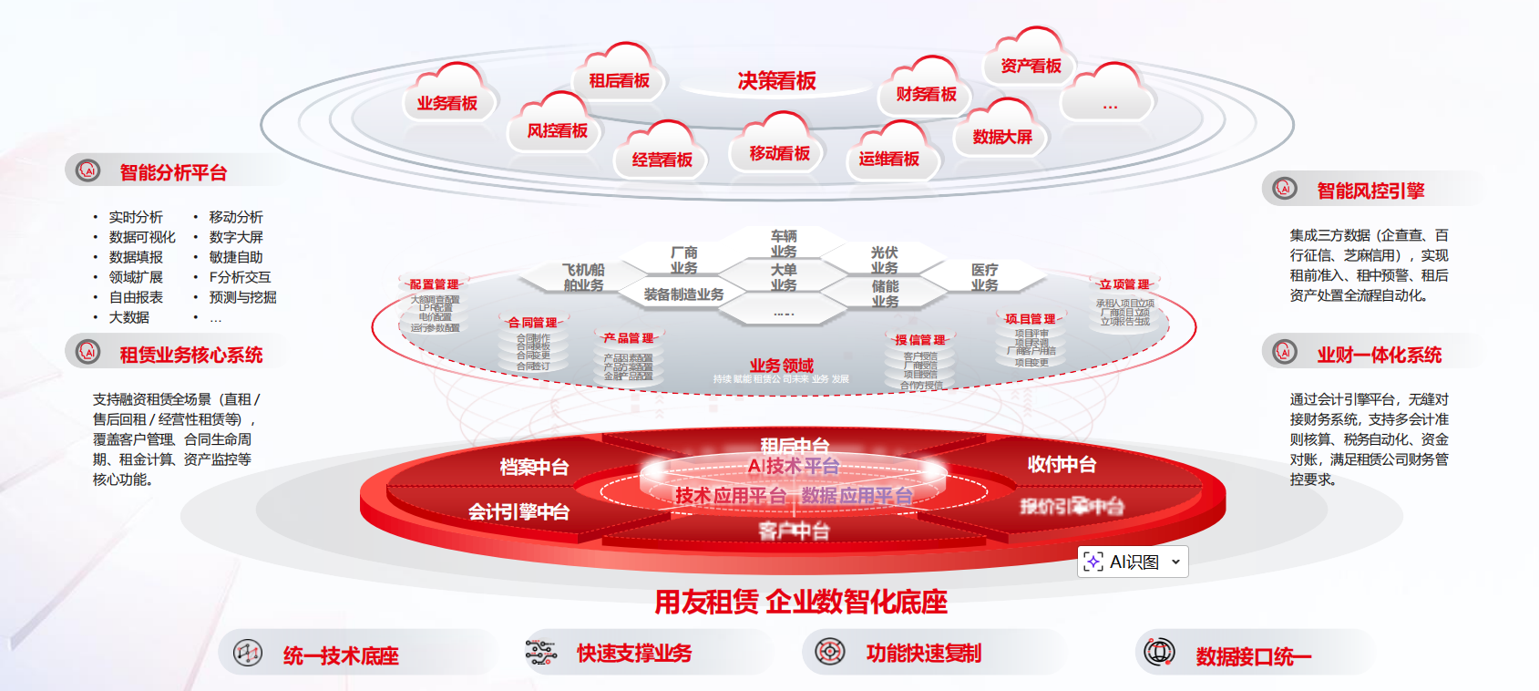 用友金融一体化平台,基于统一的数据模型和流程引擎,支持直租、回租、经营租赁、厂商租赁等主流业务并线管理。平台涵盖租赁物全生命周期管理、产品工厂、流程引擎、报价引擎、收付款一体化等13大核心能力,实现数据同源、流程贯通、生态互联,从根本上解决“烟囱式”系统带来的效率低下与合规风险。