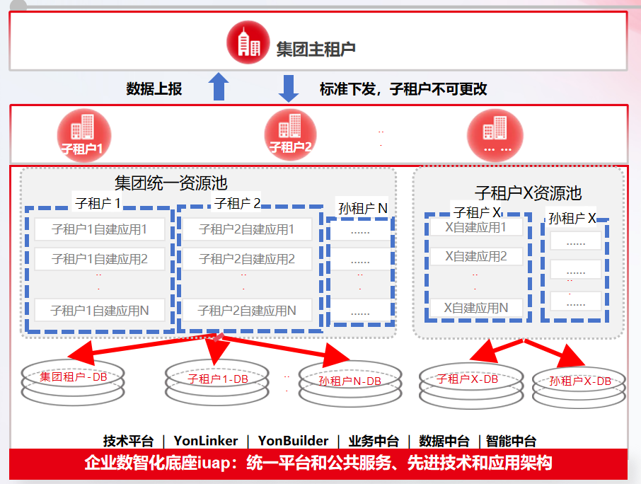 采用集团主租户 + 子租户 + 孙租户层级架构,集团主租户统一制定标准、下发数据,子租户支持独立资源池部署,满足大型子集团需求。各租户数据独立存储,保障数据安全,通过数智化技术平台实现集团与子租户高效数据交互。