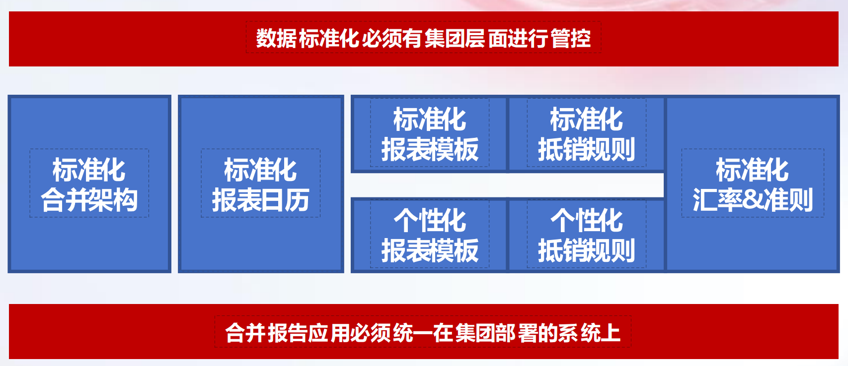搭建国际化合并报告体系,集团层面的标准化管控是重中之重,必须实现合并架构、报表日历、报表模板、抵销规则、汇率 & 准则五大核心标准化。同时在标准化基础上兼顾个性化,允许子租户根据本地需求定制报表模板与抵销规则。