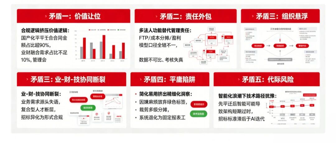 复合型人才断层是表象,根源在于管理会计的深化应用被改革、化险等硬任务边缘化。更严峻的是“能力悬浮”:业务不懂财务语言,财务固守核算思维,科技陷入工具化实施。招标环节异化为形式合规,需求编制高度依赖科技通用模板,一线经营痛点因无人“翻译”而集体失语。招标过程不再是基于价值创造的业务重构,而沦为了科技合规的机械审查。