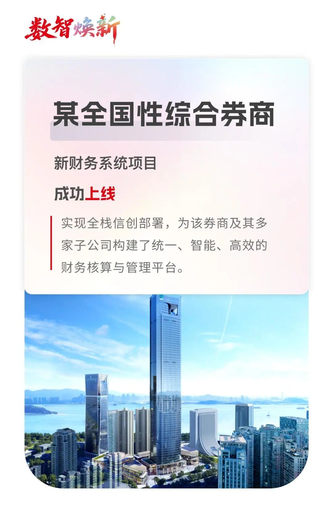 近日,由用友金融承建的某全国性综合券商新财务系统正式上线运行。该系统全面替换原有海外品牌财务系统,实现全栈信创部署,为该券商及其多家子公司构建了统一、智能、高效的财务核算与管理平台,标志着其在财务数智化转型与自主可控方面取得关键突破。