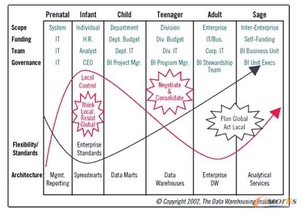 整合数据。在成人期,企业强调唯一的可靠的数据来源,用以反映事实。决策层把数据看得和员工、设备、现金一样重要,都是企业的宝贵财富。企业选择一个数据仓库或者从头创建一个新的企业级数据仓库。然后数据被从不同的数据源整合进入这个企业级数据仓库中。但是,如果有一个足够灵活的商务智能层,那么这个“把数据整合进企业级数据仓库”的过程可以省略,而是让商务智能工具直接从企业级数据仓库和外部数据中提取数据。这样的好处是,有些外部数据是无法放入数据仓库的(比如实时数据或者Web数据)。对于一些把收购作为企业发展策略之一的企业来说,企业级数据仓库和商务智能工具被作为整合被收购企业数据的主要手段。