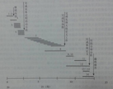 詹姆斯·马丁总结提出的进行总体数据规划的“十六步法”如图所示,其中包括主要的规划工作内容和时间进度安排,简介如下: