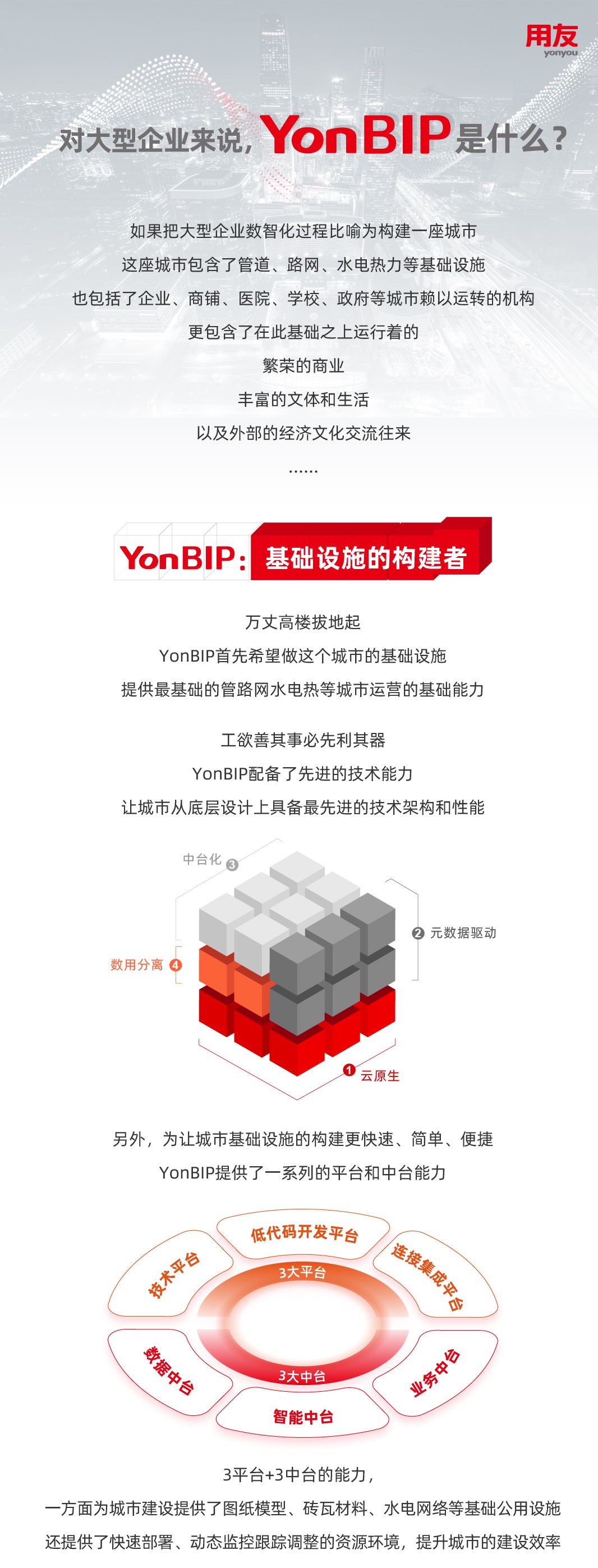 用友商业创新平台 YonBIP(Yonyou Business Innovation Platform),是用友采用新一代信息技术,按照云原生(含微服务)、元数据驱动、中台化和数用分离的架构设计,涵盖平台服务、应用服务、业务服务与数据服务等形态,集工具、能力和资源服务为一体,服务企业与产业商业创新的平台型、生态化的云服务群。