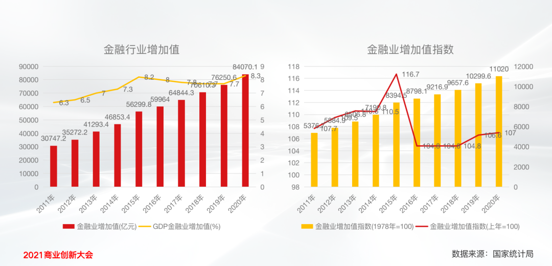 过去十年来,金融行业一直保持着6%以上的增长率,2020年金融行业增加值较十年前翻了一倍有余。经过了5年的发展,在2015年增速达到顶峰后,金融行业年增长率开始回落,但仍保持着每年5%左右的增幅。改革开放四十年来,金融行业较1978年增长110倍,对中国经济腾飞做出了较大的贡献。