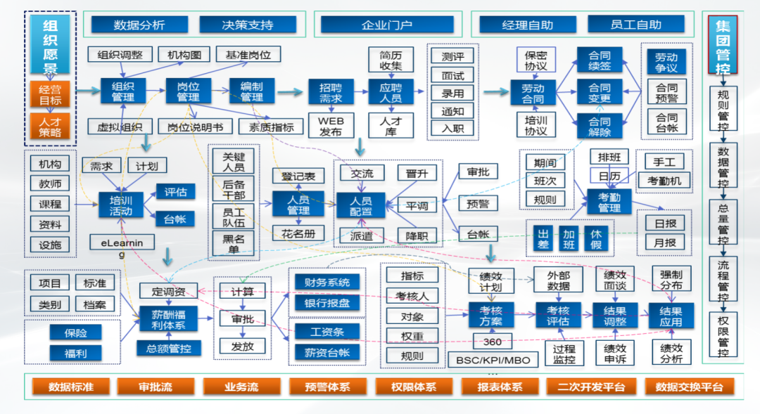 从组织愿景到人力资源政策的层层分解,人力资源政策如何落地?需要完善的人力资源流程进行执行,继而有了用友流程驱动的人力资源管理,通过构建组织架构、岗职位体系,根据岗位要求招聘和匹配对应人才,对人才进行一系列的人才管理活动。