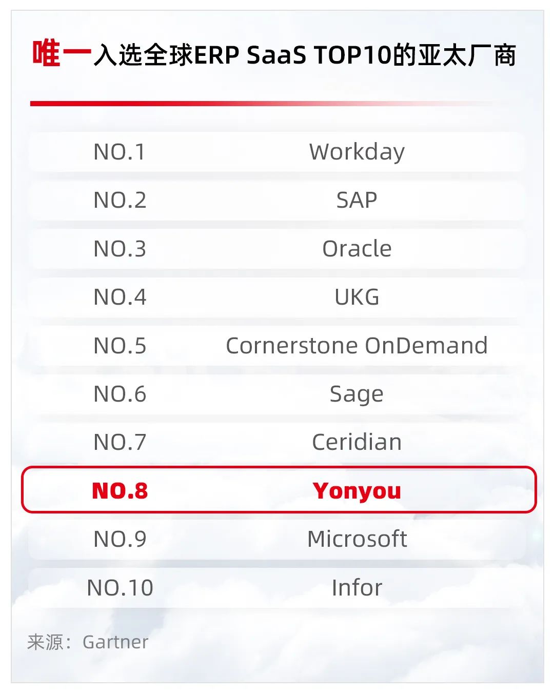 全球权威信息技术研究和顾问公司Gartner发布《Market Share: Enterprise Application Software as a Service, Worldwide, 2021》报告,用友在ERP SaaS市场位列全球第8位,是TOP10中唯一入选的亚太厂商!此外,用友在SCM SaaS市场位列全球第13位,是TOP15中唯一入选的亚洲厂商!