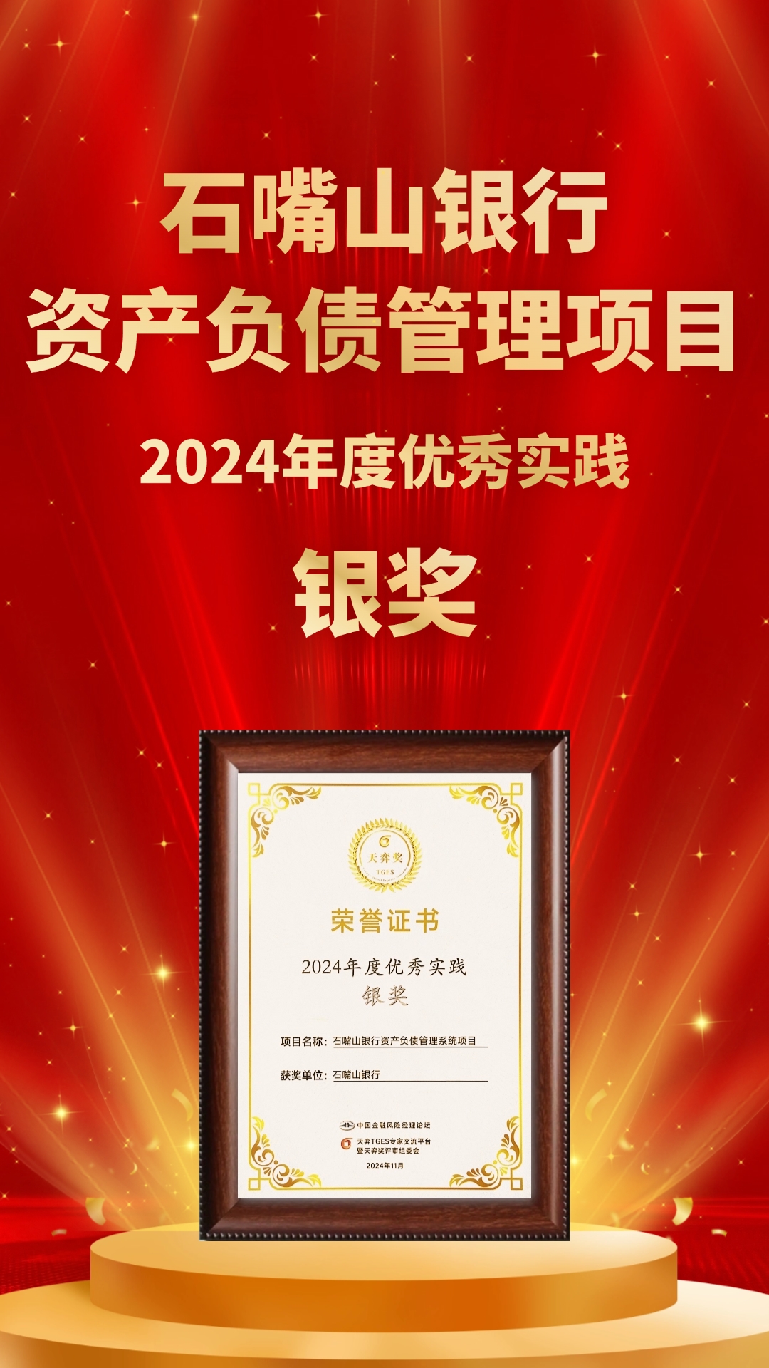 经过“天弈奖”评奖专家组的审慎评估,由用友金融承建的石嘴山银行资产负债管理系统项目荣获2024年度优秀实践银奖。这一荣誉标志着用友金融在资产负债管理数智化转型领域的又一重要认可。