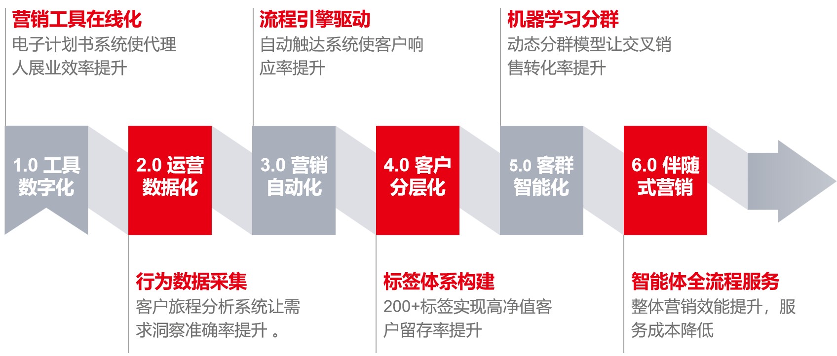 保险营销的数字化转型遵循科学的进阶路径,用友金融将其划分为工具数字化、运营数据化、营销自动化、客户分层化、客群智能化、AI伴随式营销六大阶段。头部险企的实践已验证该模型的有效性: