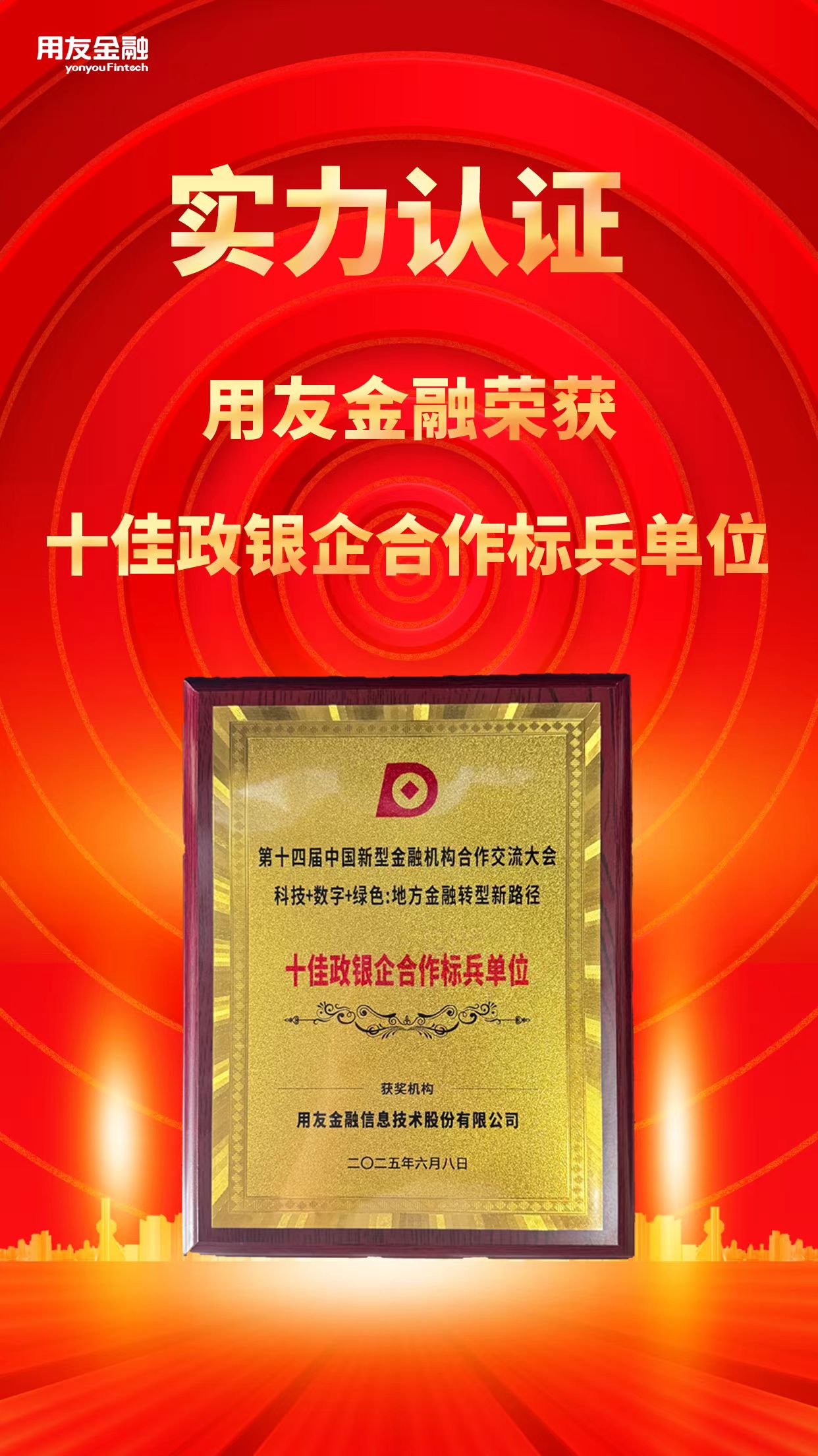 近日,经中国新型金融机构论坛组委会与全国地方金融论坛办公室遴选,用友金融荣获“十佳政银企合作标兵单位”。此次获奖是对用友金融在政银企合作体系中发挥积极作用的高度认可。