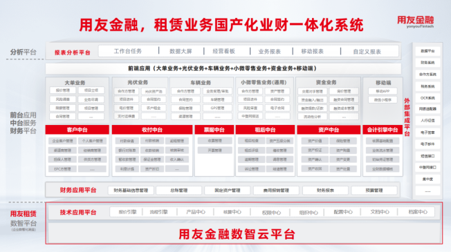 “在当前市场环境下,数智化是突破困局的唯一选择。”用友金融提出,该金融租赁公司正全面推进以“统一技术底座+统一业务平台”为核心的战略布局,通过数据治理与数据赋能双轮驱动,构建“技术+业务”一体化生态体系。这一战略与用友金融的解决方案高度契合:以标准化、模块化的技术基座打破数据壁垒,实现跨系统数据互通与资源整合;以全场景覆盖的业务中台为支撑,为租赁客户提供从方案设计、风险管控到资产运营的全生命周期服务,最终通过差异化竞争优势实现高效获客与订单转化。