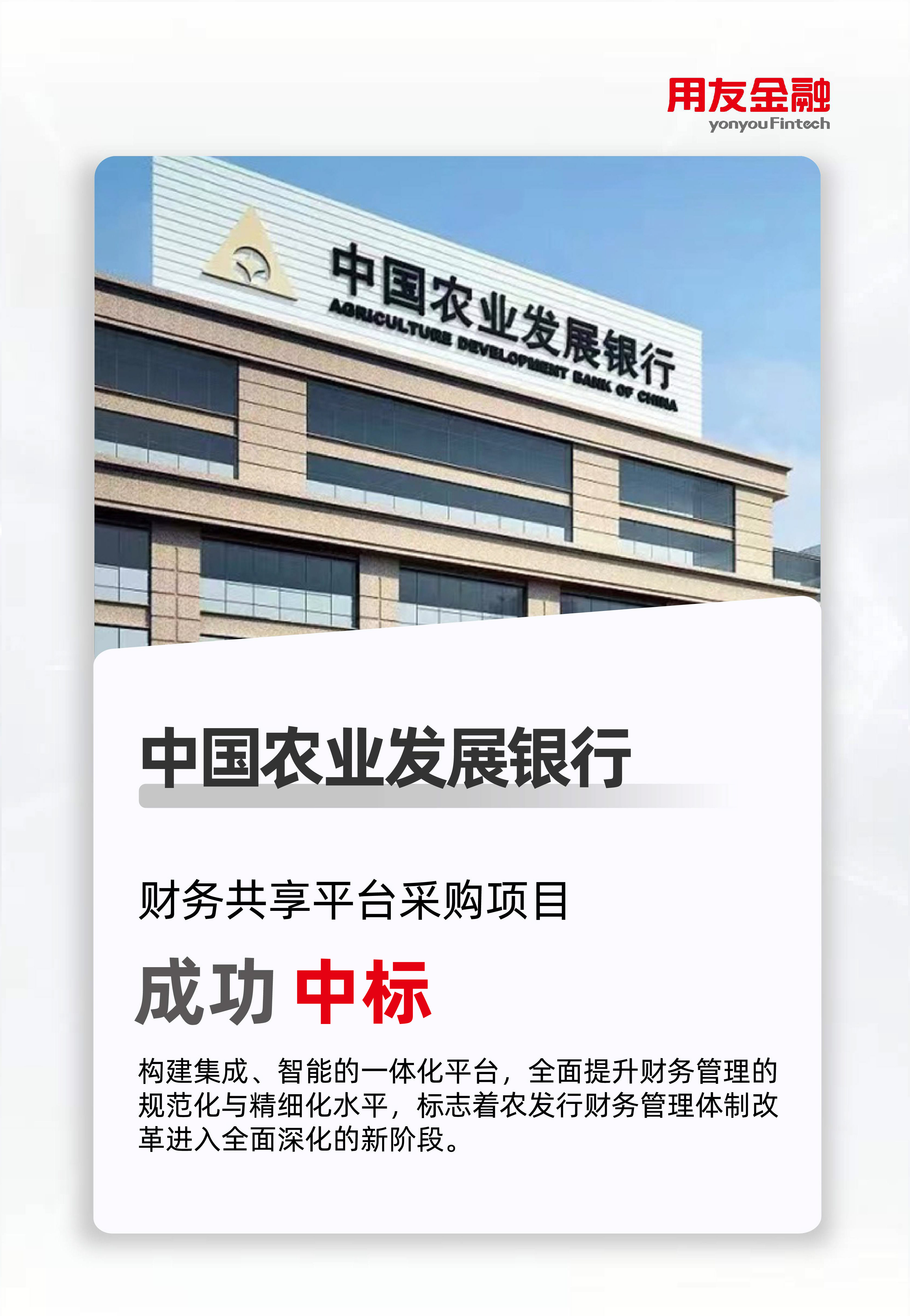 近日,用友金融成功中标中国农业发展银行(以下简称“农发行”)财务共享平台采购项目。此次合作标志着用友金融在金融科技领域再获关键突破,也意味着农发行在推进财务管理数智化转型方面迈出重要一步。