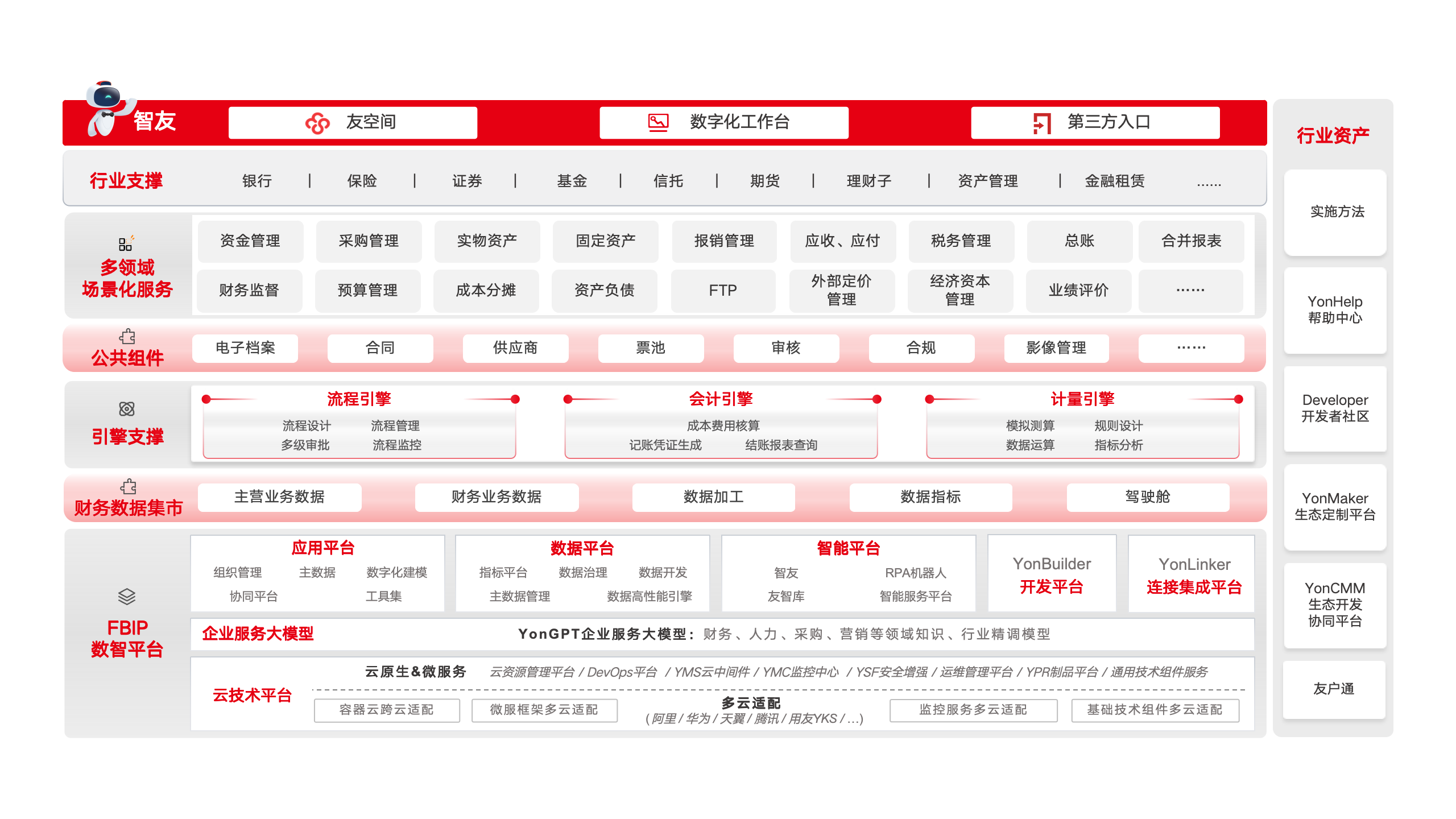 系统构建于云原生技术平台、应用平台、数据平台、智能平台、低代码平台及连接平台六大基础平台之上,已完成主流国产芯片、操作系统、数据库与中间件适配,为金融机构提供从基础设施到AI应用的全栈国产化能力。