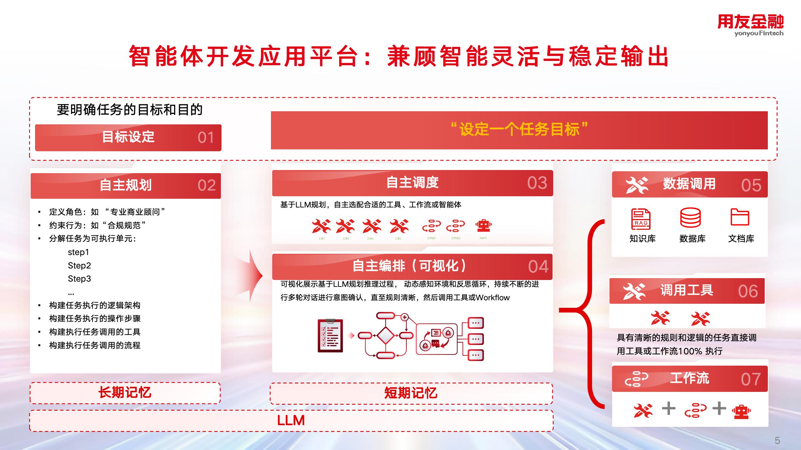 随着国务院“AI+”行动深化部署与信创战略的全面推进,人工智能正逐步从边缘辅助走向核心业务与战略决策。金融行业作为数智化转型的先行者,迎来“AI+金融”深度融合的历史性机遇。张敦奎指出:“Agentic AI不是概念炒作,而是技术演进的必然方向,也是政策驱动下的战略机遇。”作为自动化技术的尖端形态,用友金融Agentic AI具备自主规划、智能调度、长期/短期记忆实时执行与持续反思的能力,正成为推动金融企业智能化转型的核心引擎。