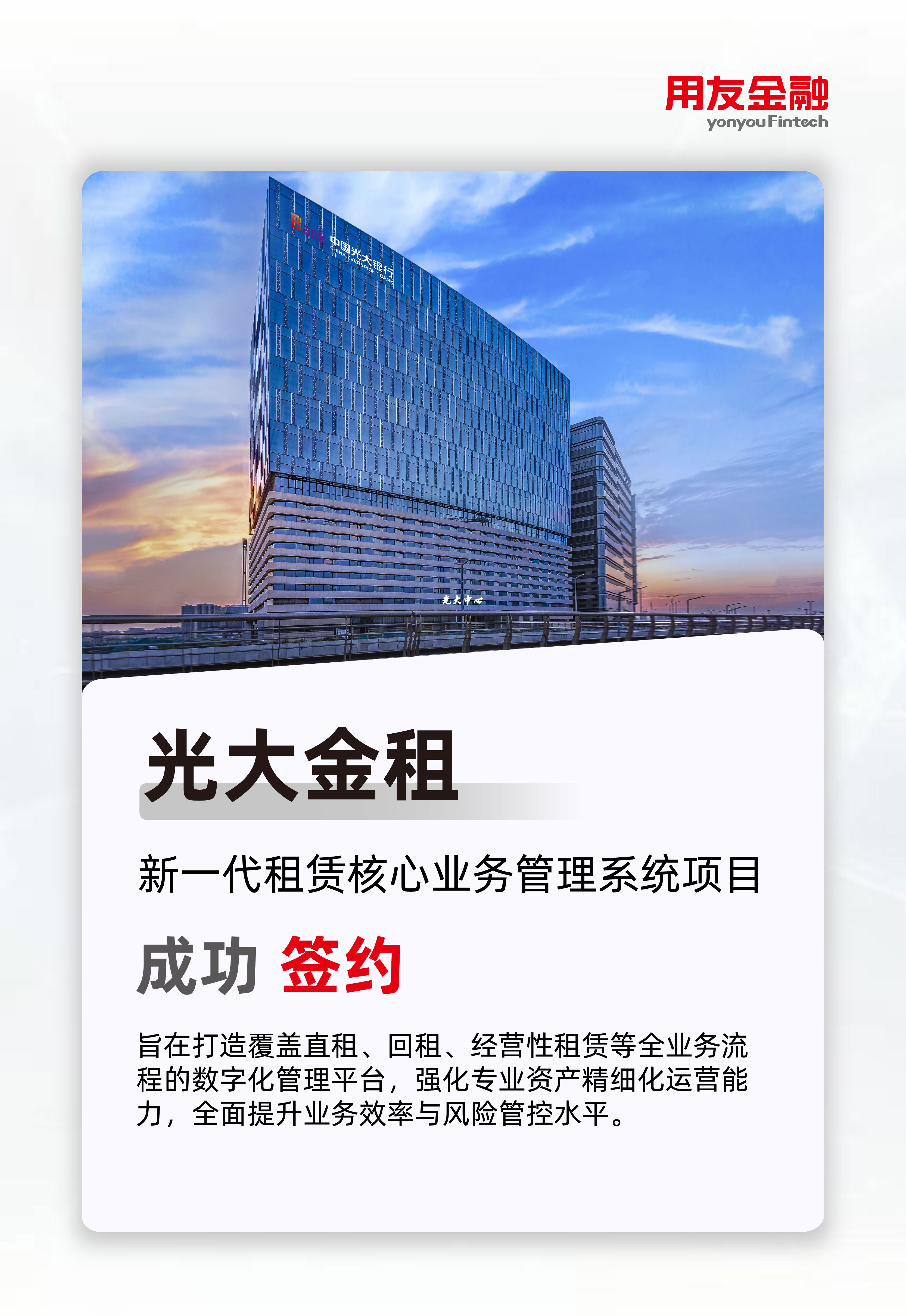 近日,光大金融租赁股份有限公司(以下简称“光大金租”)与用友金融正式达成合作,共同启动“新一代租赁核心业务管理系统”建设项目。该项目旨在打造覆盖直租、回租、经营性租赁等全业务流程的数字化管理平台,重点强化航空、船舶、新能源等专业资产的精细化运营能力,全面提升业务效率与风险管控水平,为光大金租高质量发展注入科技新动能。