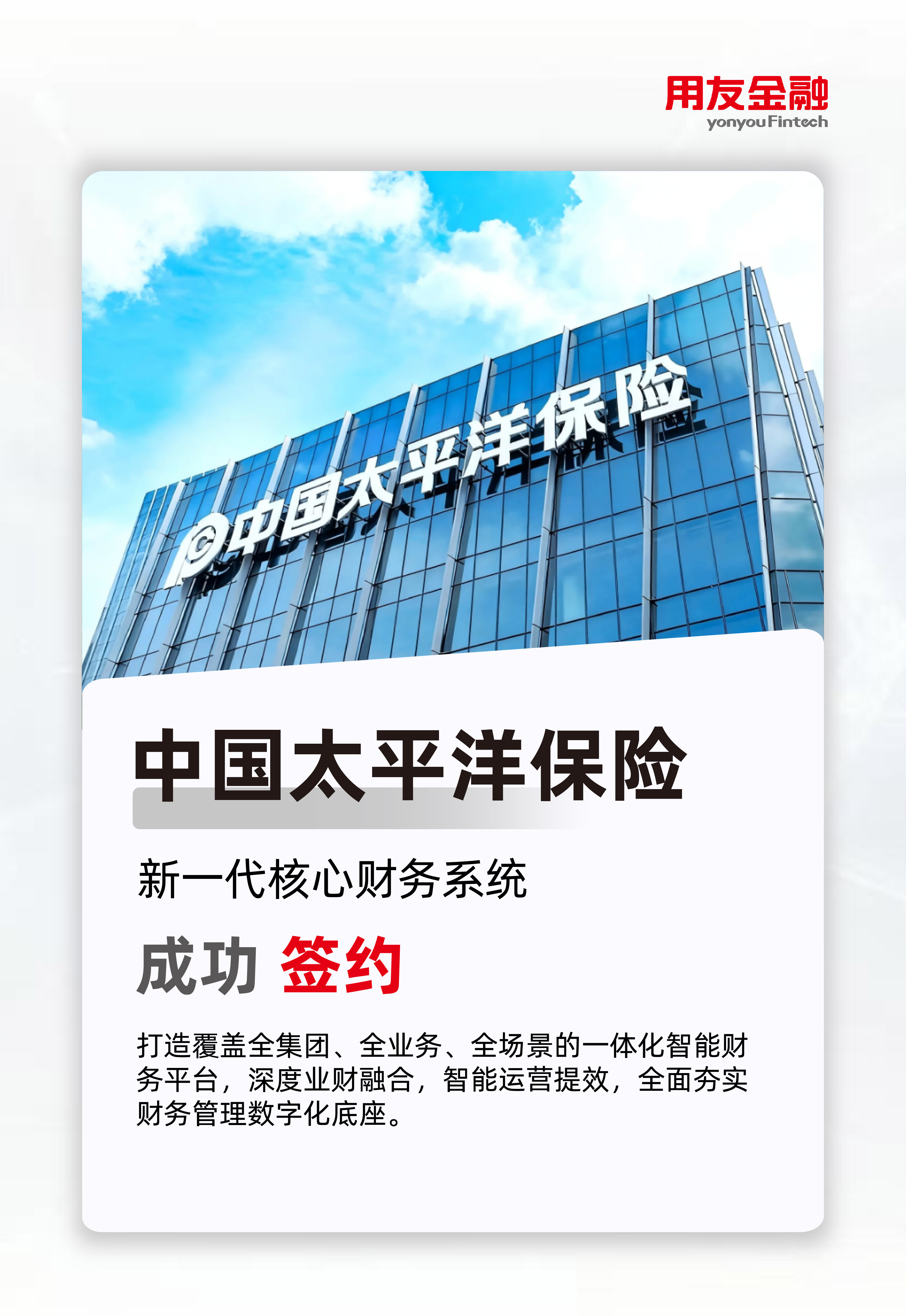 今日,中国太平洋保险(集团)股份有限公司(以下简称“中国太平洋保险”)与用友金融信息技术股份有限公司正式签署“核心财务系统软件采购项目”合作协议。双方将携手打造新一代一体化智能财务平台,全面夯实财务管理数字化底座,为中国太平洋保险高质量发展战略提供坚实支撑。