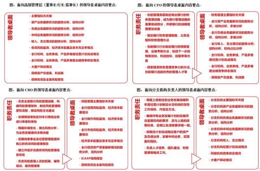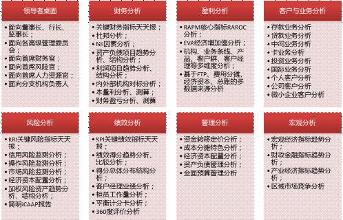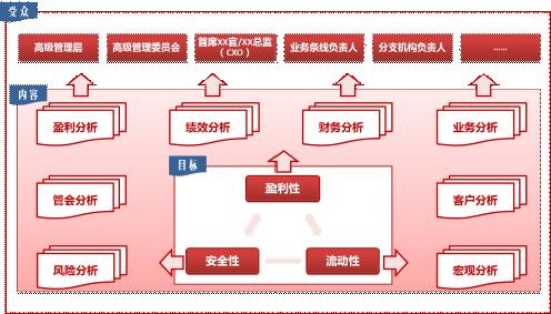 管理驾驶舱的主要面向受众是商业银行的中高层管理者,包括高级管理层(董事长/行长/监事长)、各高级管理专业委员会、首席财务官、首席风险官、首席人力资源官、分支机构负责人等。面向不同受众,针对其职务责任,提取不同主题管理驾驶舱的主要内容。平台。